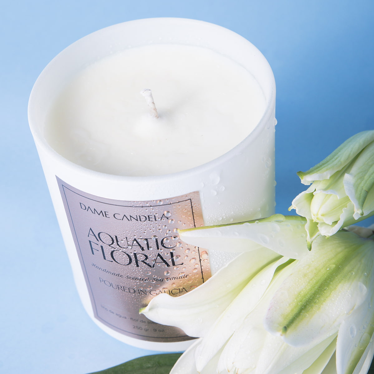 Vela perfumada 100% de soja natural en vaso de cristal mate blanco.